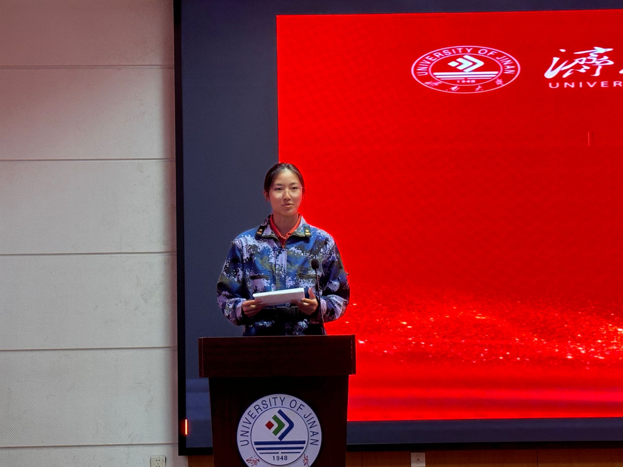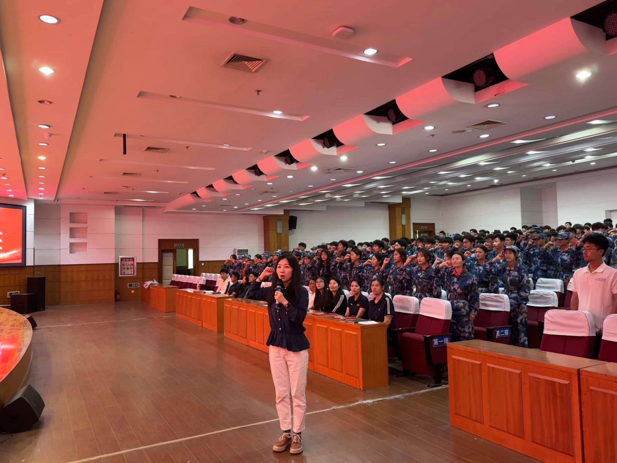 会议在激昂的旋律中拉开帷幕。第一阶段暖场环节,2025级新生以饱满的热情合唱《歌唱祖国》,嘹亮的歌声回荡在报告厅内,不仅展现了新生们蓬勃向上的精神风貌,更表达了对祖国母亲的深情祝福,为即将到来的国庆佳节增添了浓厚的喜庆氛围。